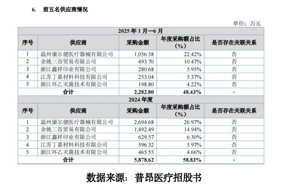 同时,迈得医疗2024年年报显示,普昂医疗该年是迈得医疗的第五大客户,向迈得医疗进行了1296.26万元的采购交易,但招股书显示,2024年普昂医疗来自第五大供应商的采购金额为465.55万元,且前五大供应商中并未出现迈得医疗的身影 。这一信息差异引发了市场对企业信息披露准确性的关注。
