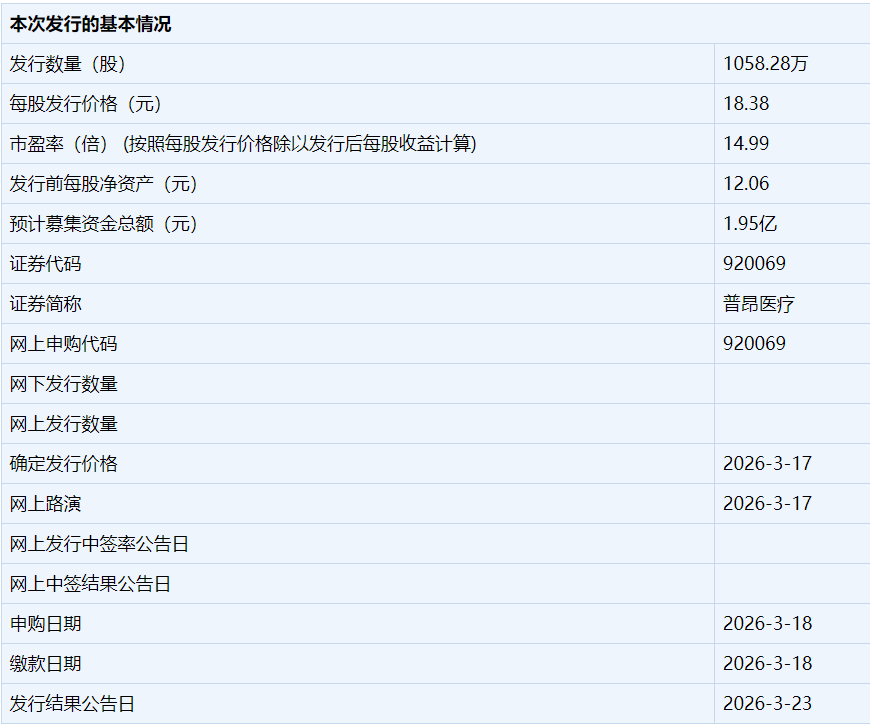 3月18日,普昂(杭州)医疗科技股份有限公司正式开启申购,股票代码920069,发行价格18.38元/股 。这家专注于慢病诊疗医疗器械的企业,拟募集资金1.95亿元,用于穿刺介入医疗器械智能制造生产线建设、微创介入医疗器械研发及产业化等项目。