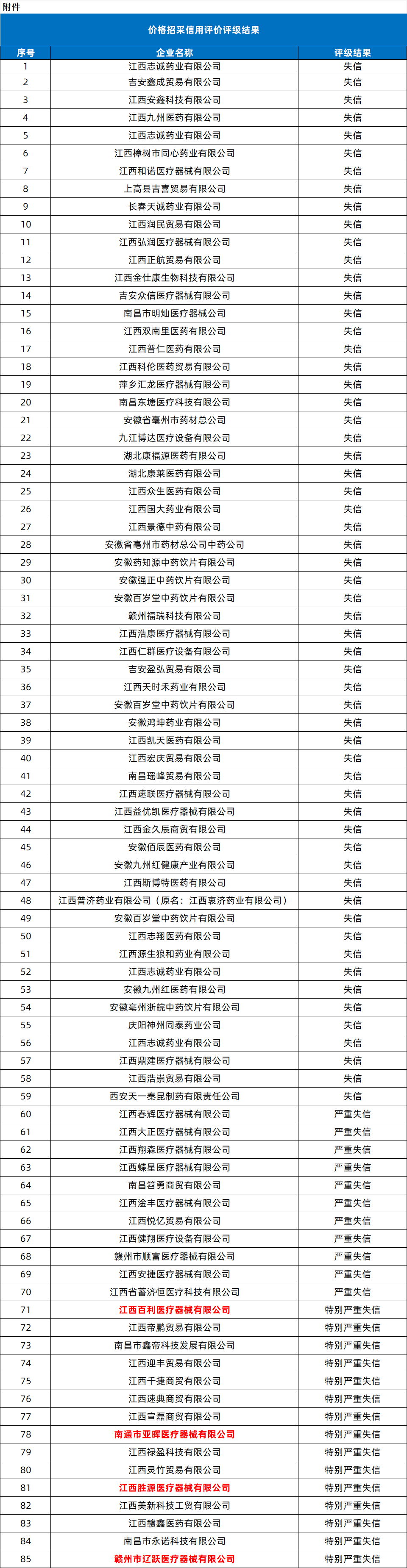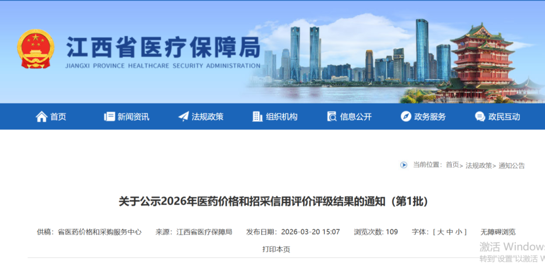 3月20日,江西省医保局发布了《关于公示2026年医药价格和招采信用评价评级结果的通知(第1批)》。