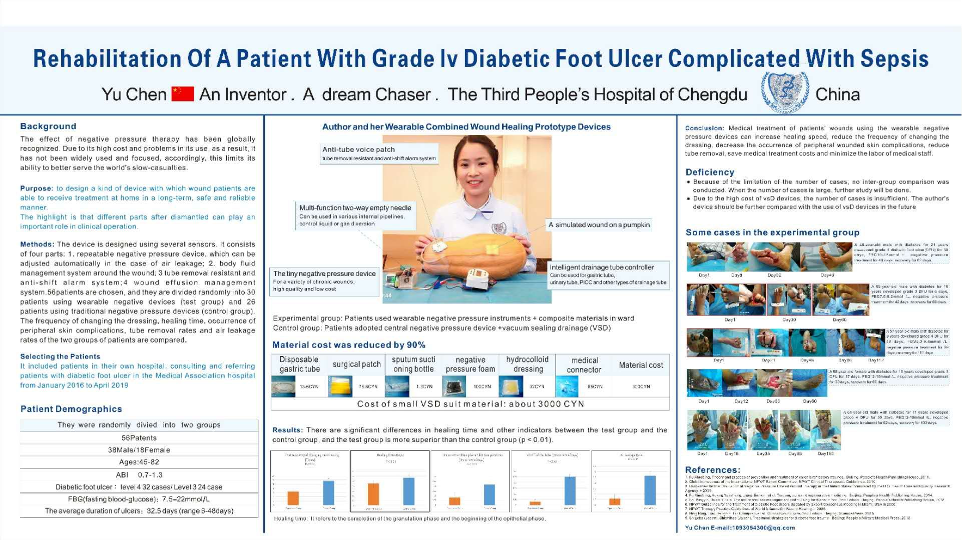 封闲负压伤口的治疗技术是近十几年全球推广的伤口治疗技术。目前,国内负压伤口治疗多采用美国、德国等进口设备:体积大,不便于携带,大部分患者只能住院治疗;价格昂贵,让很多难愈性创面的患者难以承受。该促愈合装置小巧便携、价格便宜、灵敏精准,为难愈性创面的患者提供了质优价廉的解决方案。